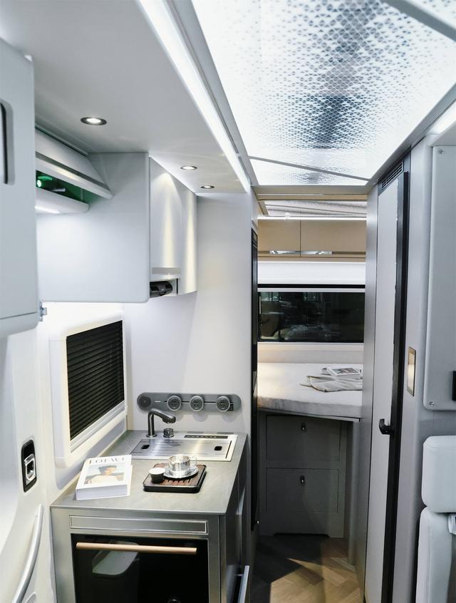 车身采用五明治复合材料与笼式结构设计,5995mm×2433mm×2892mm的紧凑尺寸下,实现了C照可开的灵活操控与A型房车的空间优势。